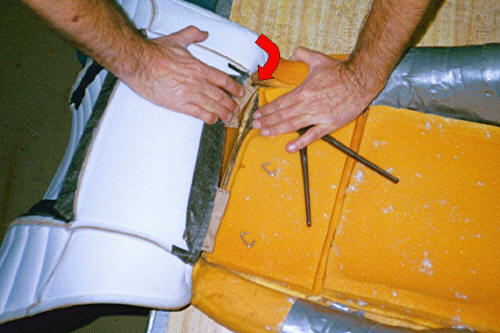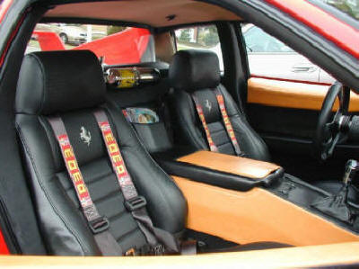 Seat Belt Slots option 4 slots: $40 (does both seats). These 'slots' are sewn in 'tongues' of leather buried into the front and rear seams at the base of the headrest. They allow you to pass a 2-3 inch seat belt through the upholstery. < Shown here: 4 slots (2 under each headrest) for use with a 4-Point racing harness. |